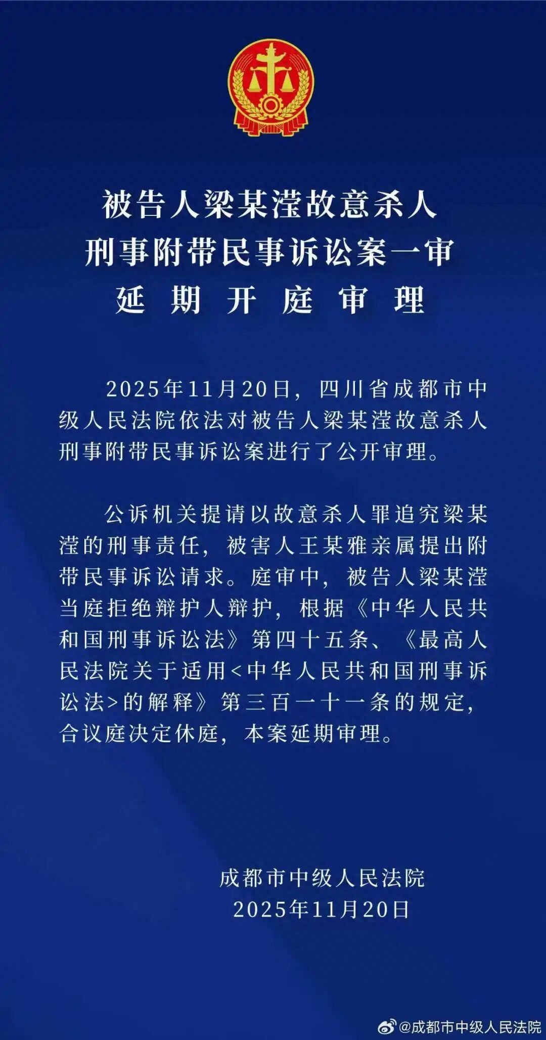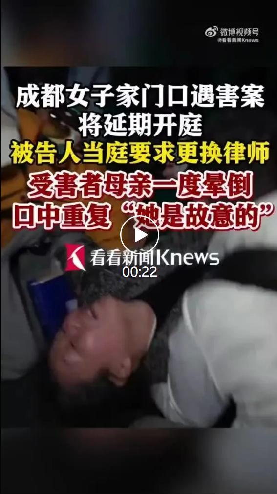 图源成都市中级人民法院昨天,经过数小时庭审,法院宣布休庭,择日开庭。另据看看新闻报道:受害者母亲走出法院,口中一直重复“她是故意的,她是故意的”,甚至情绪激动一度晕倒。