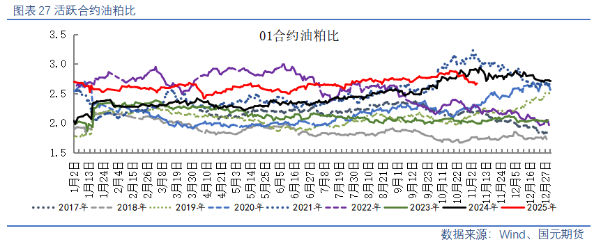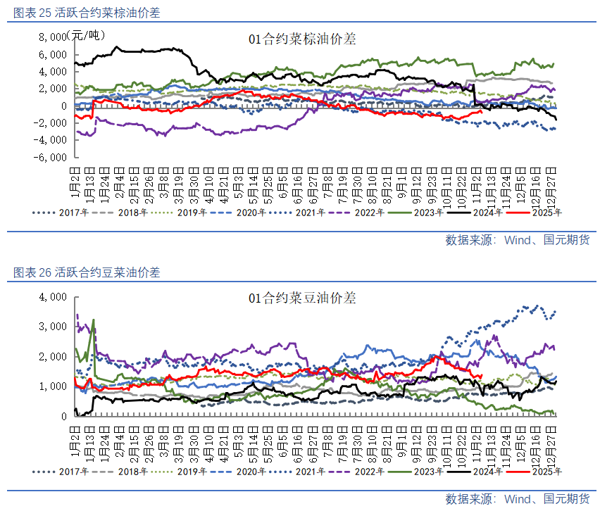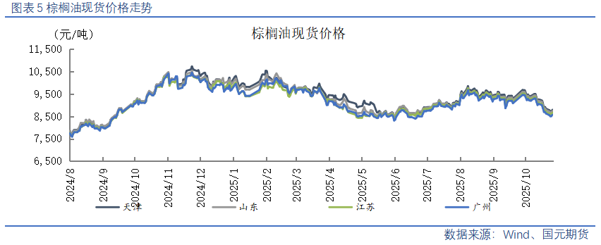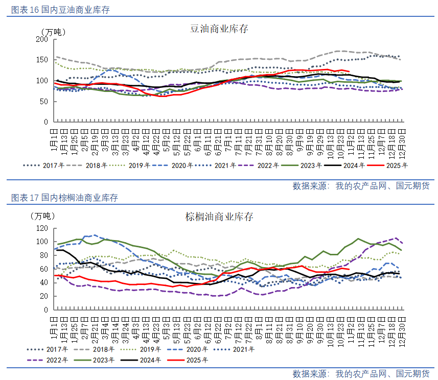 【棕榈油】10月棕榈油产量增加导致马棕库存压力较大,市场预计10月底棕榈油库存可能举升至两年高位,预估产量激增至去年来最高水平,并超过出口需求。不过,棕榈油减产预期依旧存在且在11月进一步强化,棕榈油产地报价下方空间有限。国内豆棕价差继续修复,棕榈油性价比逐渐提升,11月有部分到港带动商业库存反弹,关注12月买船情况。