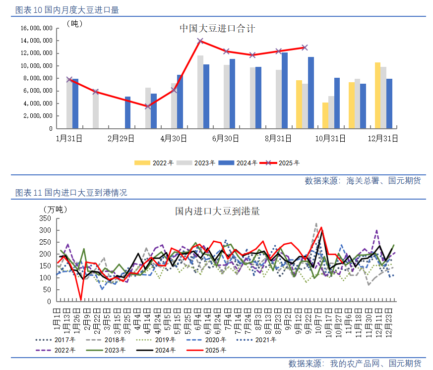 【中国2025年10月大豆进口948.2万吨】据海关总署数据显示:中国2025年10月大豆进口948.2万吨,环比9月进口减少338.7万吨,较2024年10月进口量同比增加139.5万吨,增幅为17.25%。2025年1-10月中国累计进口大豆总量为9568.2万吨,同比增574.5万吨,增幅为6.39%。